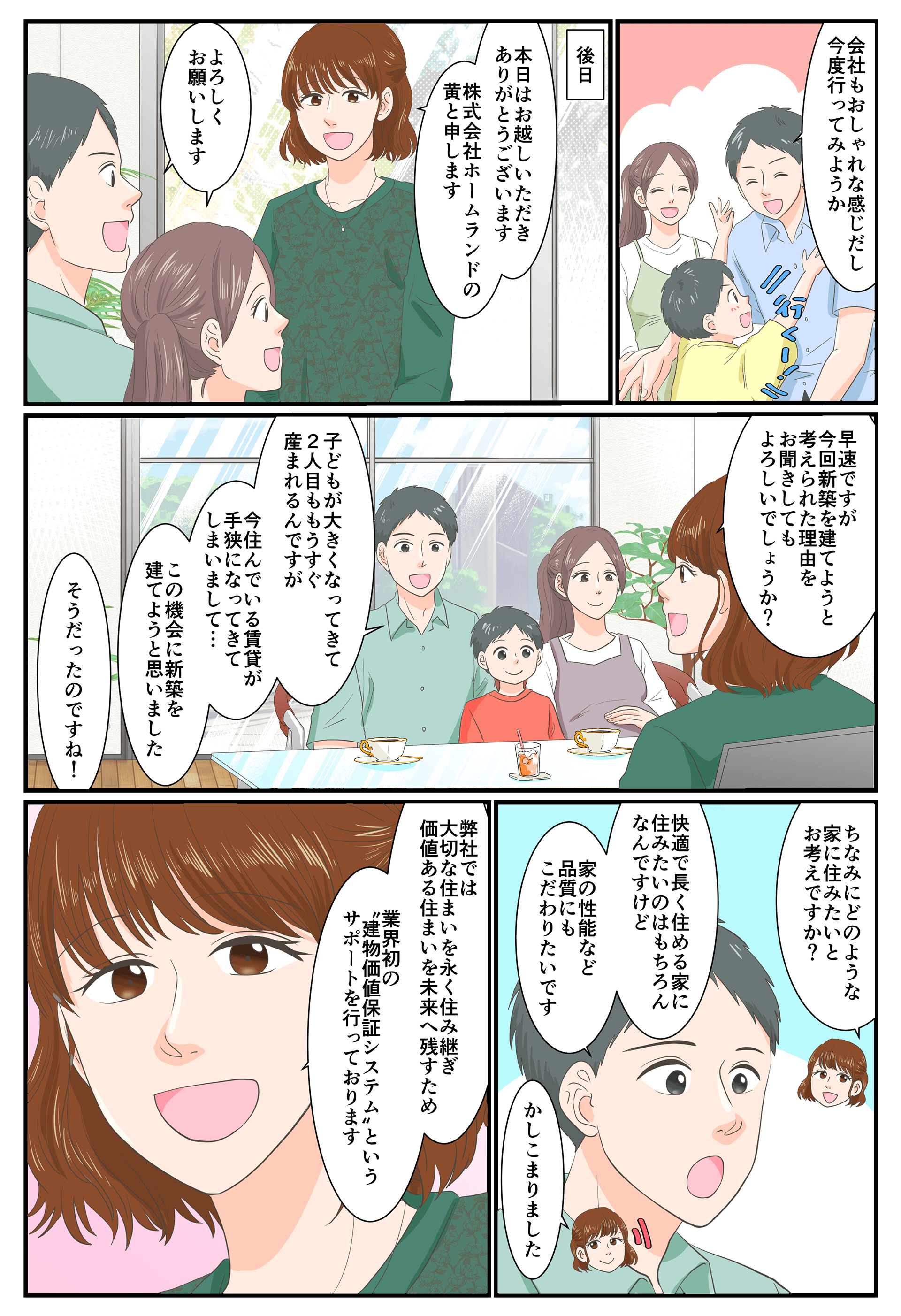 - 「あ、そういえば私の友達が“株式会社ホームランド”さんで新築を建てたみたいなんだけど、すごく対応がよかったって言ってたわ!」