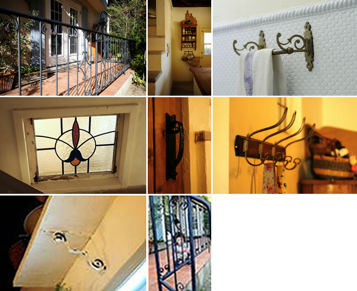 アイアンは一般的に同じものはつくりません。外部のテラスのフェンス、バルコニーの手すり、玄関灯の受け金具、窓飾りの金具、屋根や塀の飾り、内部では、棚受け、カーテンポール、ドアノブ、建具ノブ、タオルホルダーなどご予算に応じて制作いたします。