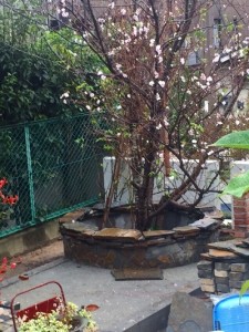 苦労したのが大阪冬桜の周りにつくった花壇です。上には石を積み重ねて側面にはその石材を張りました![]()