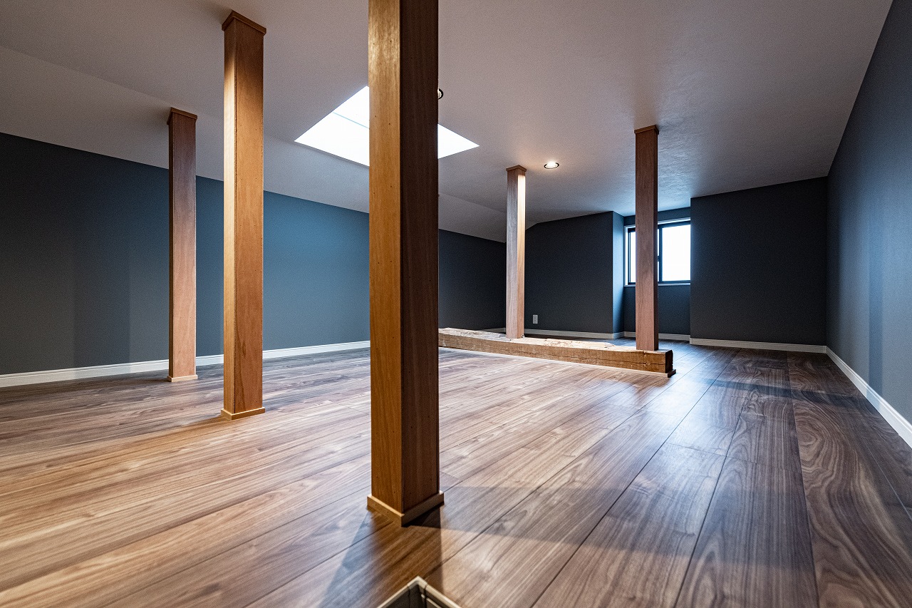 屋根裏部屋も落ち着いた色合いですが、トップライトの光のおかげで暗くなりません。