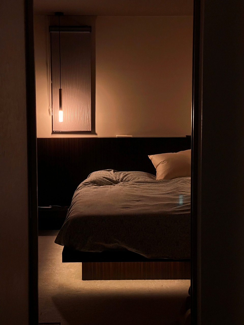 主寝室はホテルライクで、オーダーベットを造作して、眩しくないように足元に間接照明