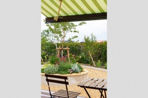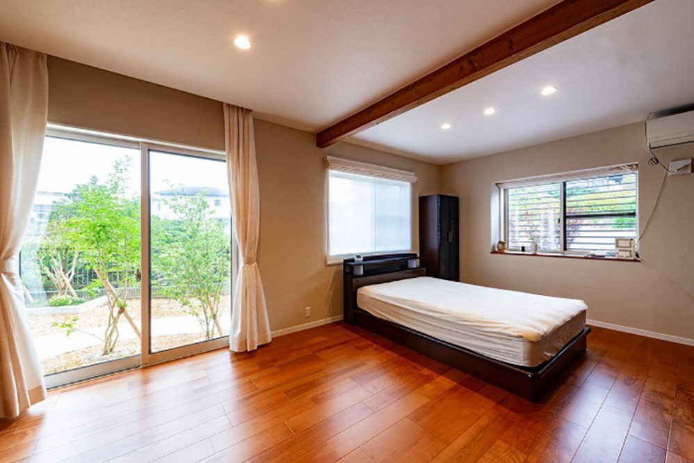 そこで提案したのが、庭は,和風の庭木と庭石を撤去して、イングリッシュ風ガーデンに一新しました。正面玄関口には車の駐車も可能にして、子供さん達が庭で遊べるように広場をつくりました。南側の垣根は高さを落し、リビングやデッキから眺望を楽しむことができるようにしました。